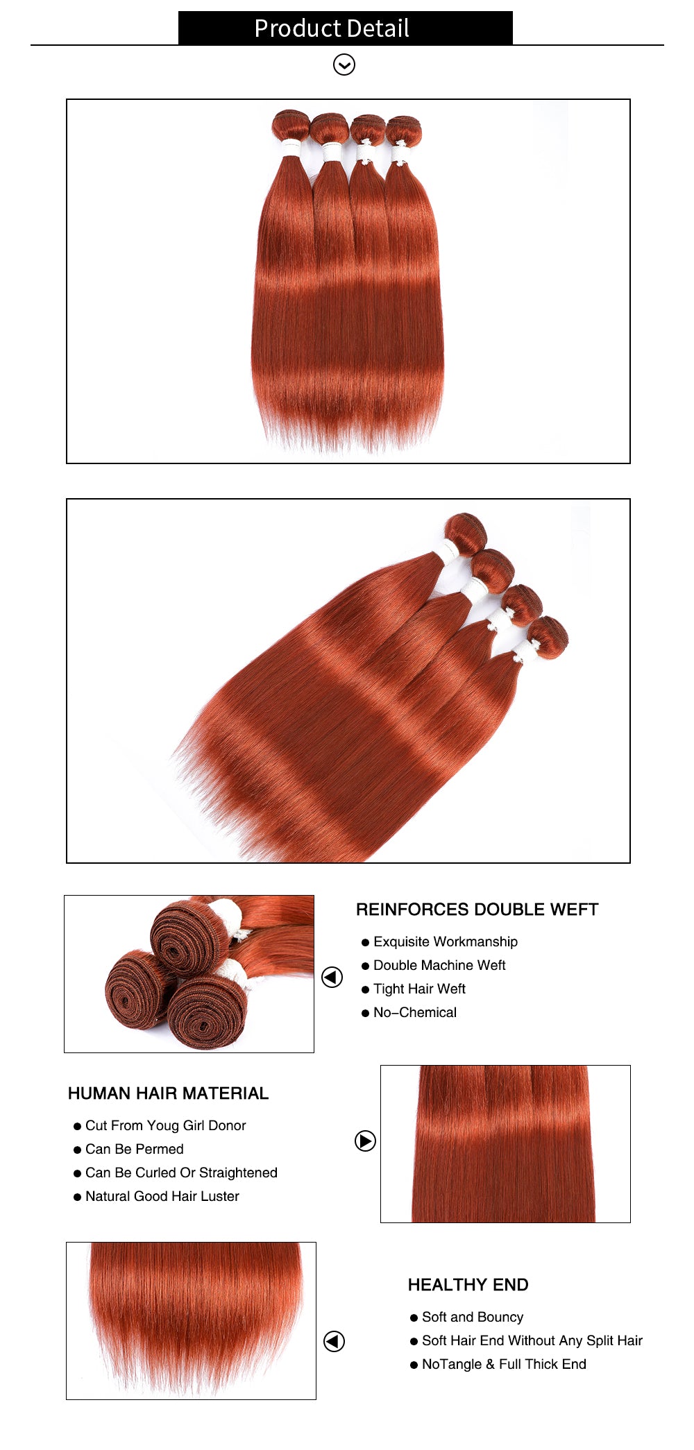 Straight Burnt Orange Color 350 Remy Human Hair Bundles 4 PCS Kemy Hair