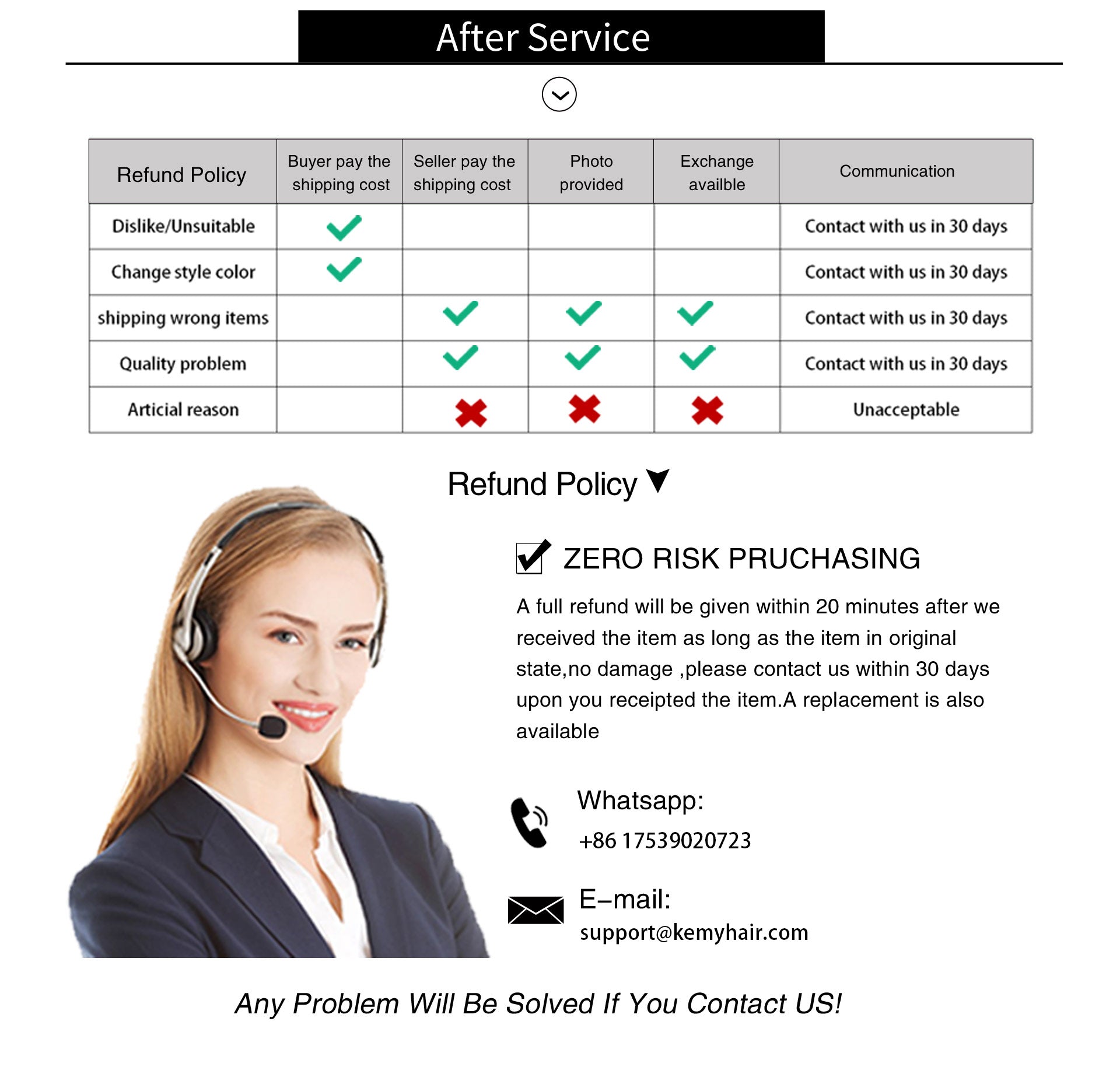 ►Return/refund for the quality problem: Please send us an email with your order number entitled if the item you received has any quality problem. such as wrong color, wrong size, wrong style, and so on. It will be more persuasive if you attach a picture of the packing box containing the shipping information and a picture of the item you received in the email. We will look into the case once we receive your email, then offer you some solutions.